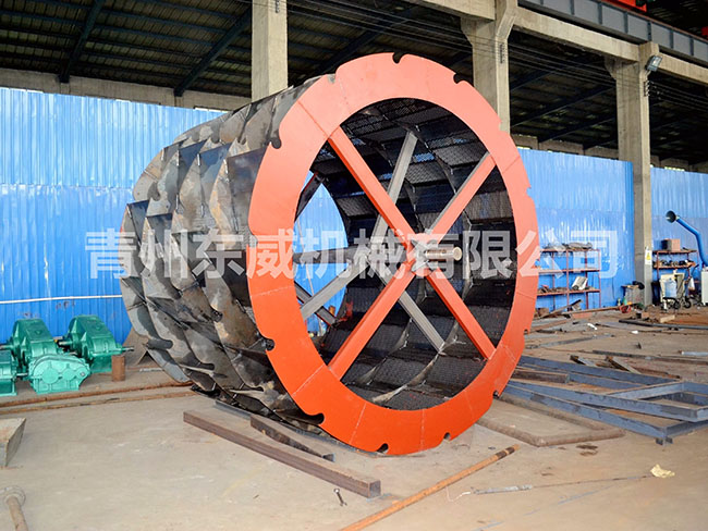 海沙淡化沖洗機的工作原理如同一臺滾筒式洗衣機,滾筒內(nèi)設(shè)置螺旋葉片和抓斗,確保進料、出料自動完成;滾筒旋轉(zhuǎn)攪拌,供水系統(tǒng)連續(xù)不斷注入淡水,對海砂進行反復(fù)沖洗,使含鹽水不斷地從洗沙機溢水口溢出,完成去鹽工作。